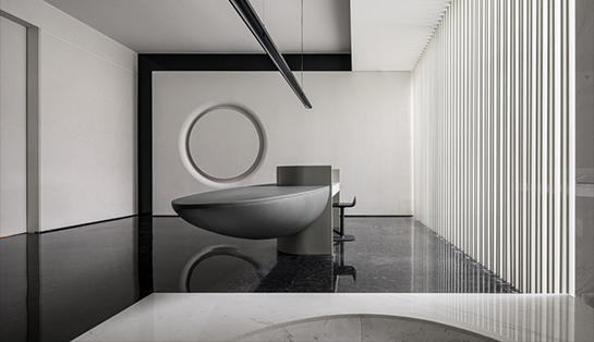 步入空间,两扇高耸冷冽的金属拉门缓缓拉开,像一场的舞台剧目的开始。石材雕塑里映射到天花粼洵波