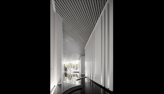远……回转返折进入洽谈区,庭院的水景像一面铺开的中国长卷绘画映入眼目,空间的诗意犹然而生。微波